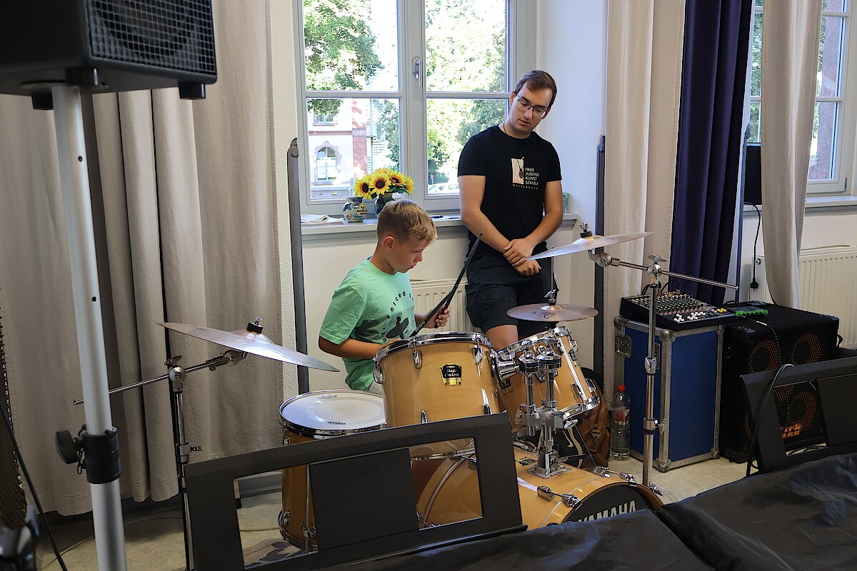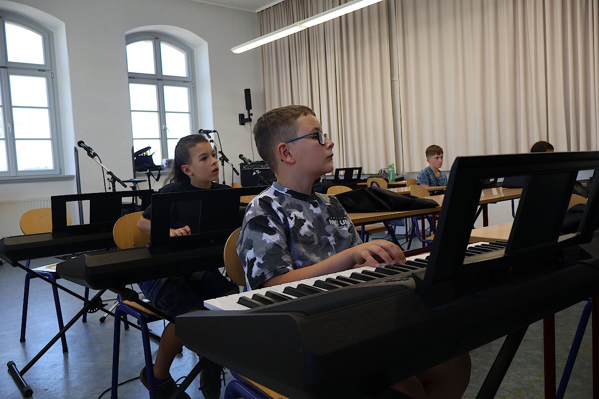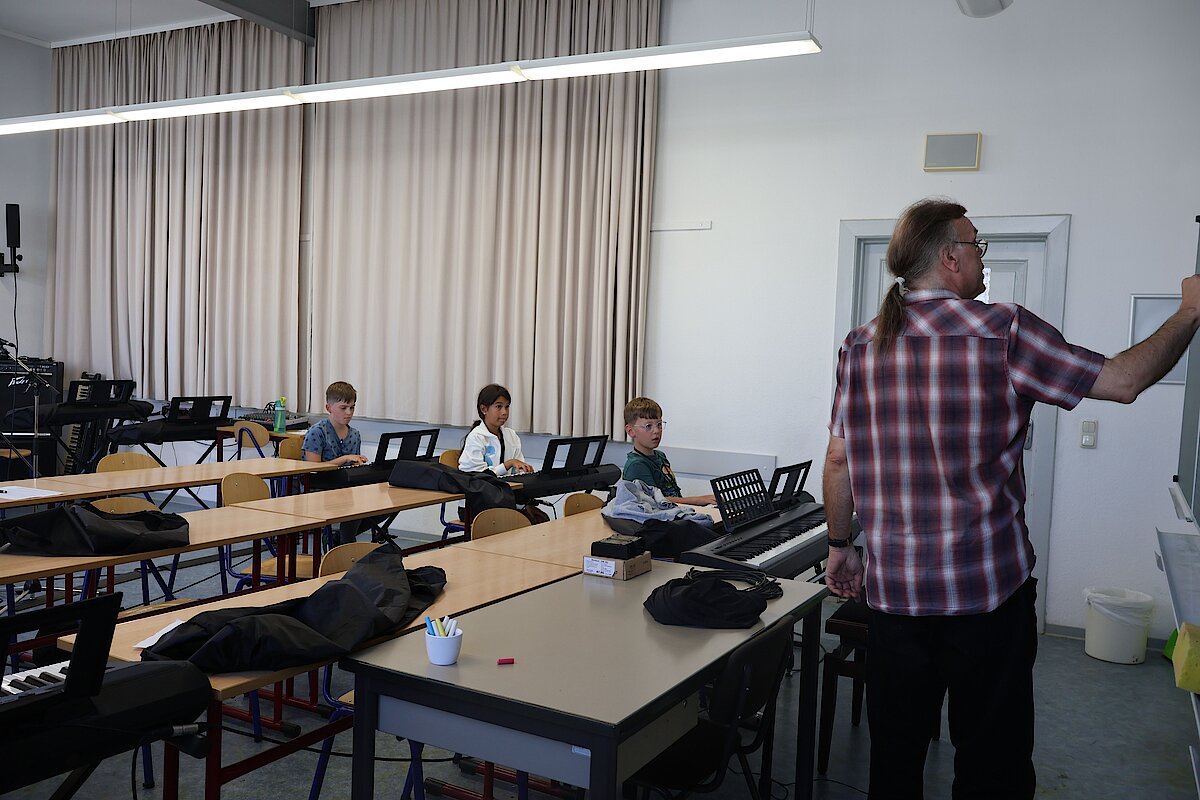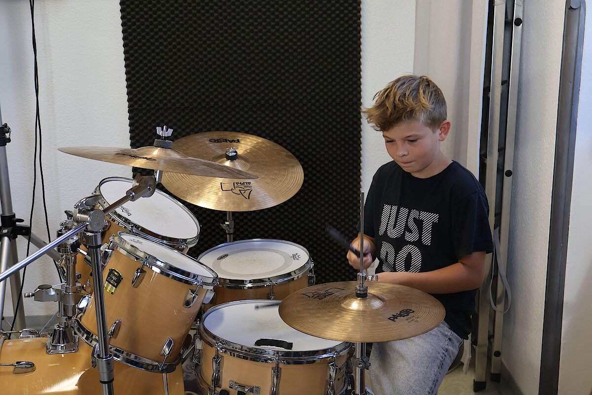 In kleinen Gruppen lernten die Kinder die Vielfalt der Instrumente kennen – und konnten sich natürlich auch selbst ausprobieren. Am Schlagzeug war Taktgefühl gefragt, das einige schon erstaunlich gut unter Beweis stellten. Bei E-Gitarre und Bass wurde gefühlvoll gezupft, und die ersten Töne konnten sich durchaus hören lassen.