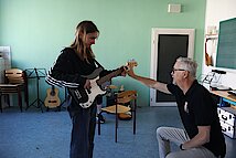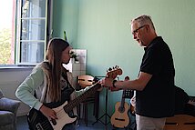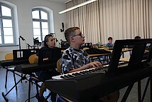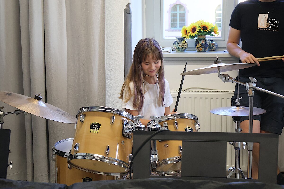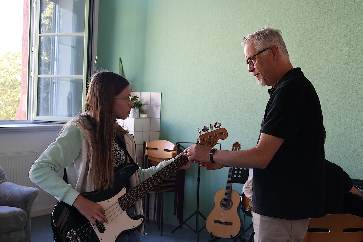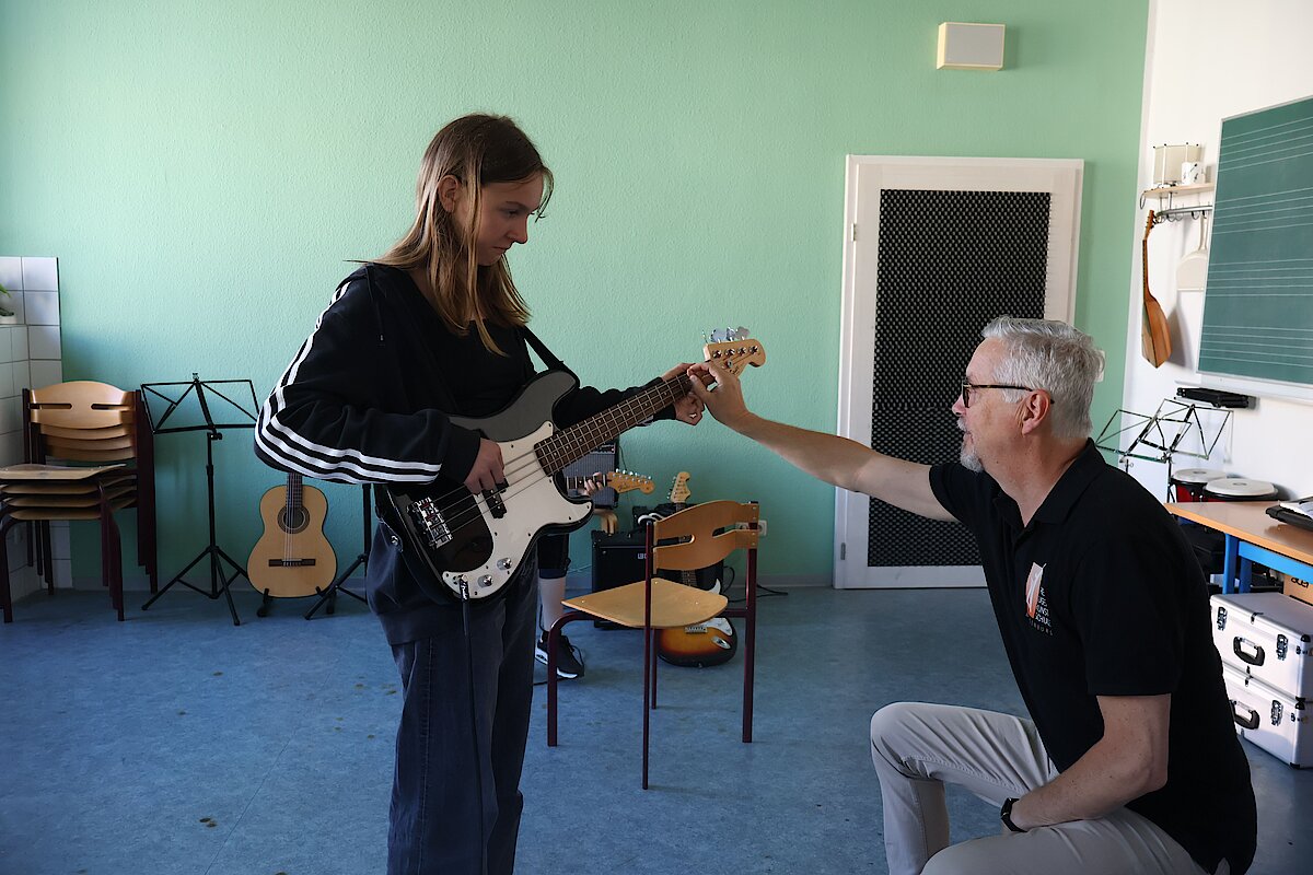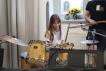 In kleinen Gruppen lernten die Kinder die Vielfalt der Instrumente kennen – und konnten sich natürlich auch selbst ausprobieren. Am Schlagzeug war Taktgefühl gefragt, das einige schon erstaunlich gut unter Beweis stellten. Bei E-Gitarre und Bass wurde gefühlvoll gezupft, und die ersten Töne konnten sich durchaus hören lassen.