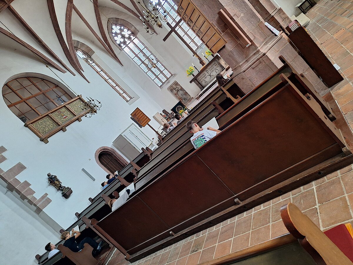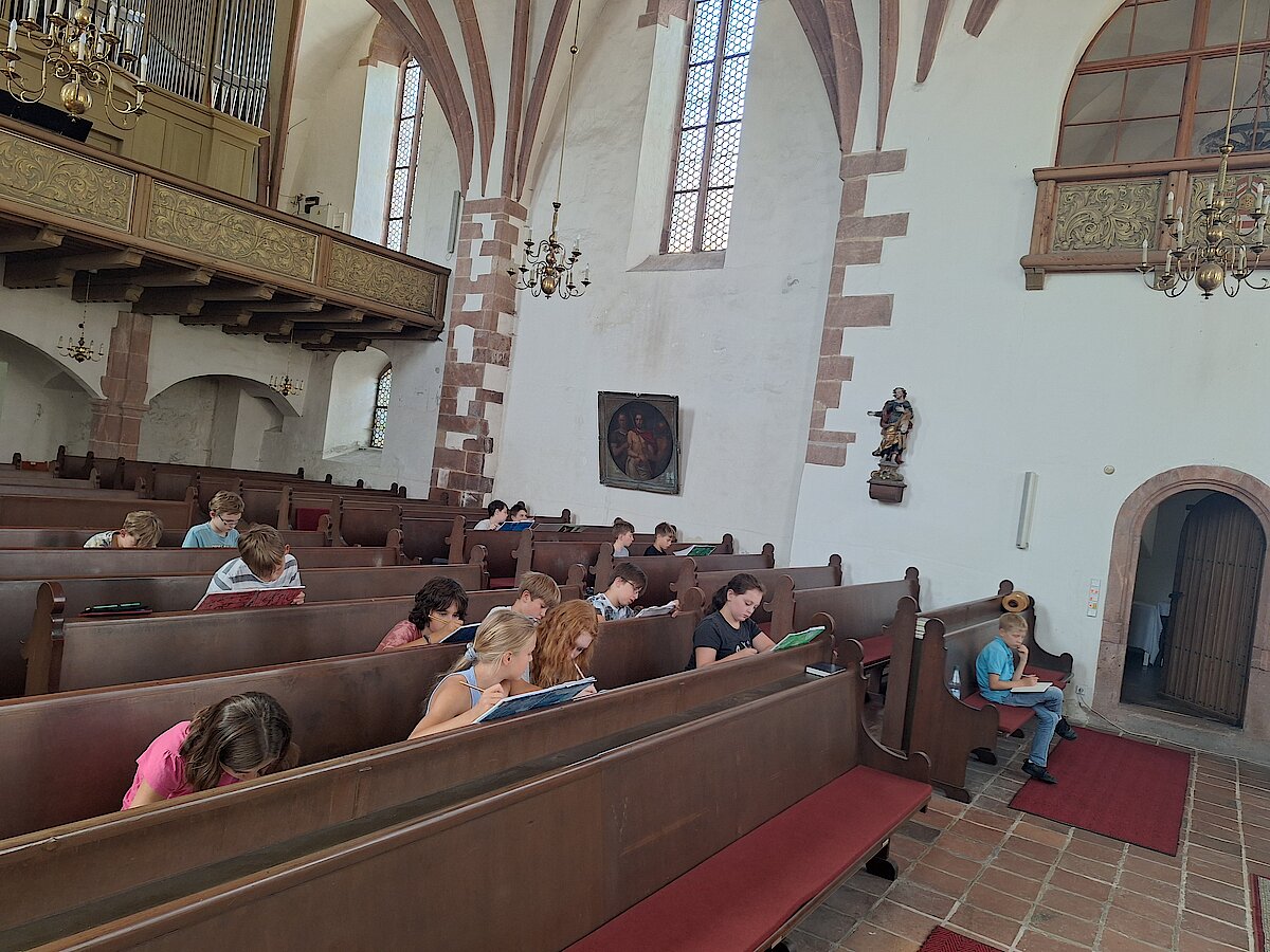 Unser Kunstunterricht der Klasse 6 fand diesmal nicht wie sonst im Klassenzimmer statt, sondern an einem ganz besonderen Ort: der St. Bartholomäuskirche in Waldenburg. Dort haben wir uns mit dem Thema „Ausblicke erleben und wiedergeben – Kirchenfenster haben schon viel gesehen“ beschäftigt.