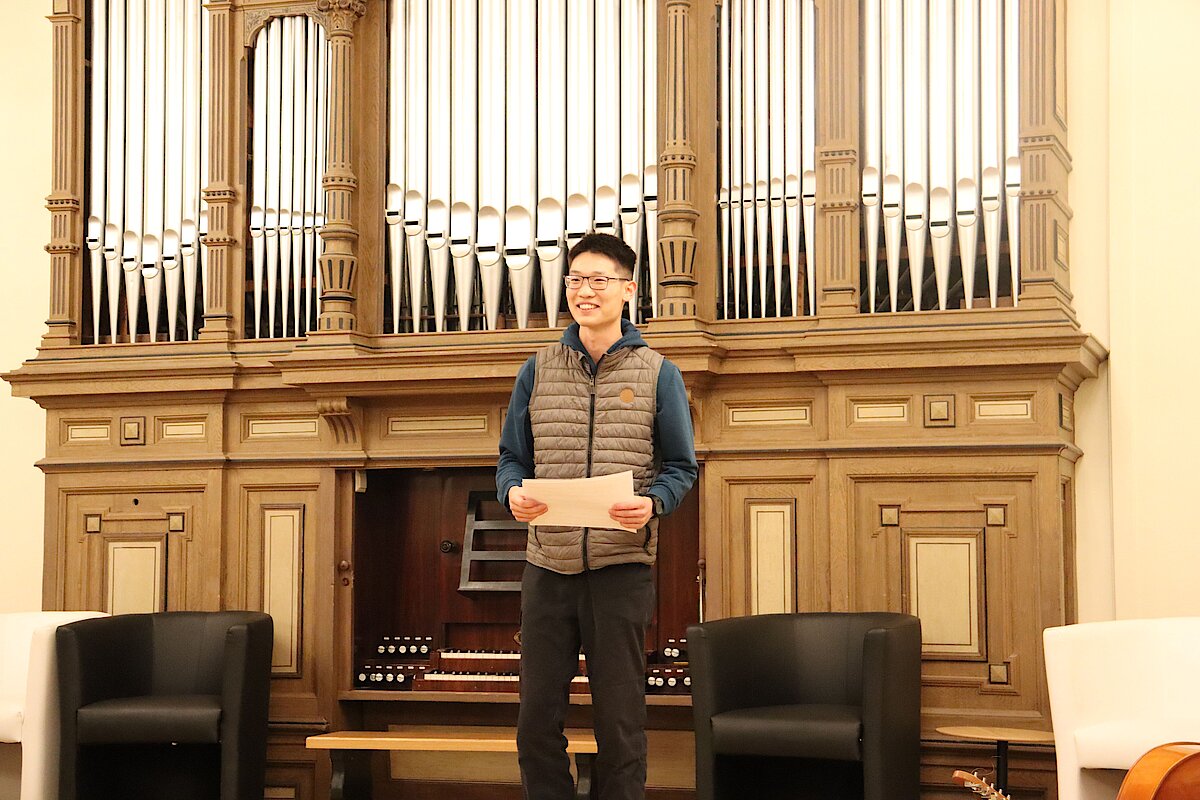 Ein weiterer Höhepunkt im Veranstaltungsplan der Freien Jugendkunstschule Waldenburg war die Musizierstunde am 4. November 2024, die dieses Mal in der Aula des Europäischen Gymnasiums stattfand. Grund war die Kreuzbach-Orgel, die in der Aula installiert ist. Das erste Stück des Abends wurde an dieser beeindruckenden Orgel von Li Zhaoyang gespielt, der mit Bachs Kleinem Präludium in G-Moll einen stilvollen und kraftvollen Auftakt setzte.