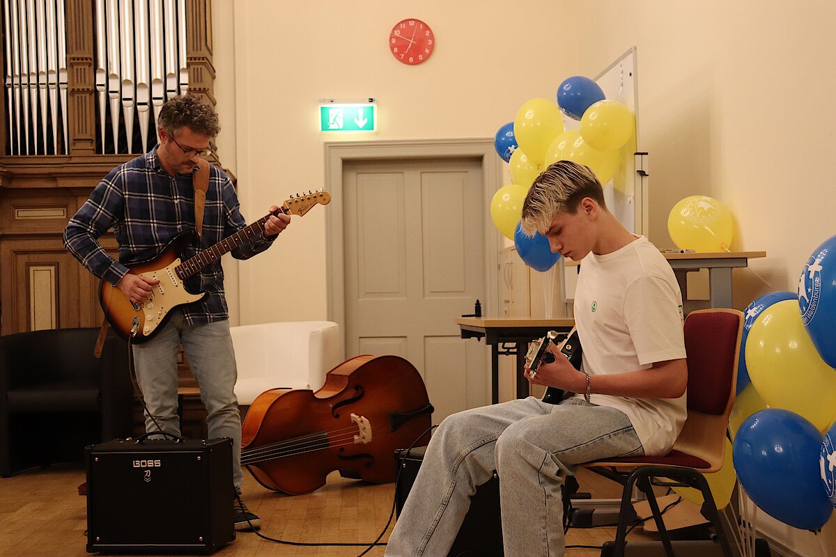 Im Anschluss folgten abwechslungsreiche Beiträge aus verschiedenen Musikrichtungen. Mathilde Gagelmann und Henriette Eger begeisterten mit Gesangsstücken von Franz Schubert und Ludwig van Beethoven. Beide trugen ihre Lieder mit großer Musikalität und Ausdruckskraft vor. Danach betrat Leander Fröhlich die Bühne, der mit einer einzigartigen Version von Sultans of Swing von den Dire Straits das Publikum in seinen Bann zog. Leander, von seinem Lehrer Herrn Meiner auf der Gitarre begleitet, zeigte sowohl stimmlich als auch instrumental beeindruckende Fähigkeiten.